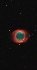 NGC 7293, the Helix Nebula, lies just 655 light-years away in Aquarius — a vast, glowing eye in space. Through the Seestar S50, its teal and crimson filaments surround a fading white dwarf. This is a Sun’s quiet farewell — stellar death transformed into beauty, its elements recycled into future stars.