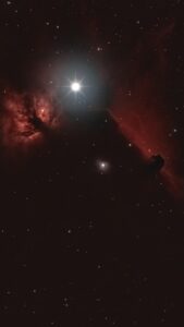 IC 434 glows behind the Horsehead Nebula in Orion, 1,375 light-years away. Through the Seestar S50, its red hydrogen light forms a radiant backdrop for the famous dark silhouette. Ionized by Sigma Orionis, this region captures the essence of stellar creation — light and shadow shaping new stars amid cosmic dust.