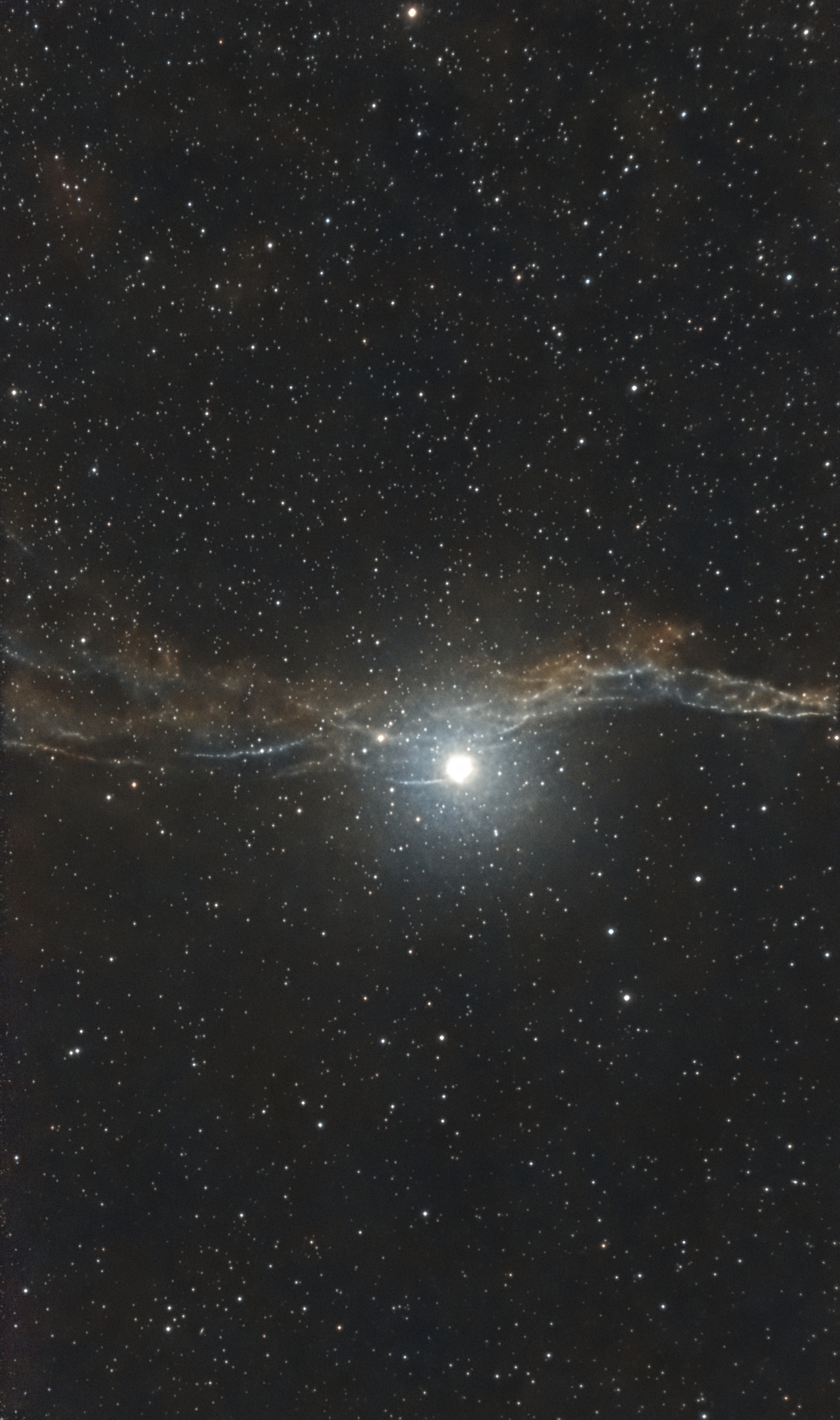 At the center of the original supernova lies an expanding bubble of debris stretching more than 100 light-years across, known collectively as the Cygnus Loop. NGC 6960 forms the western edge of that enormous structure, weaving through the sky near the bright foreground star 52 Cygni. Though that star appears connected, it is merely a chance alignment; the nebula itself lies far behind it.